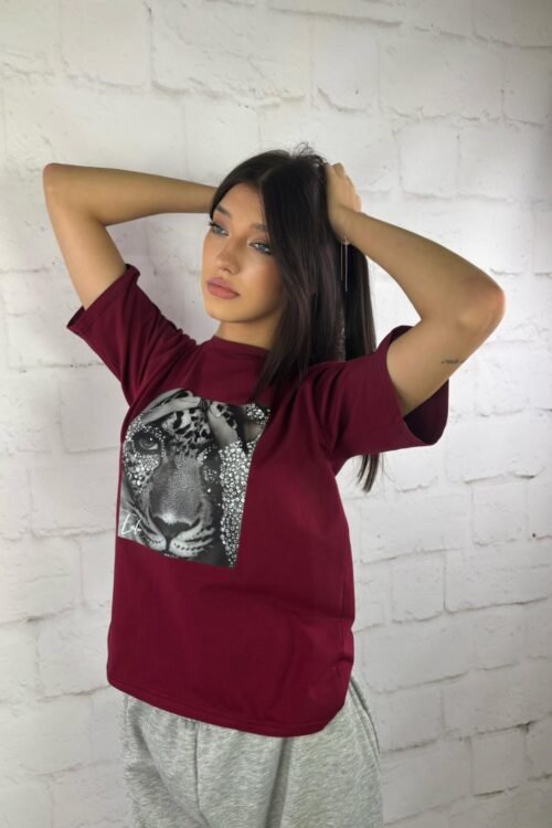 Elegancka koszulka w kolorze burgundowym, z nadrukiem pantery w odcieniach czerni i bieli, ozdobionej połyskującymi detalami. Minimalistyczna, a zarazem efektowna – świetny wybór dla osób ceniących oryginalne wzory. Doskonale sprawdzi…