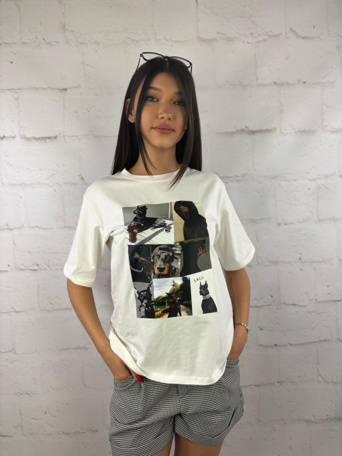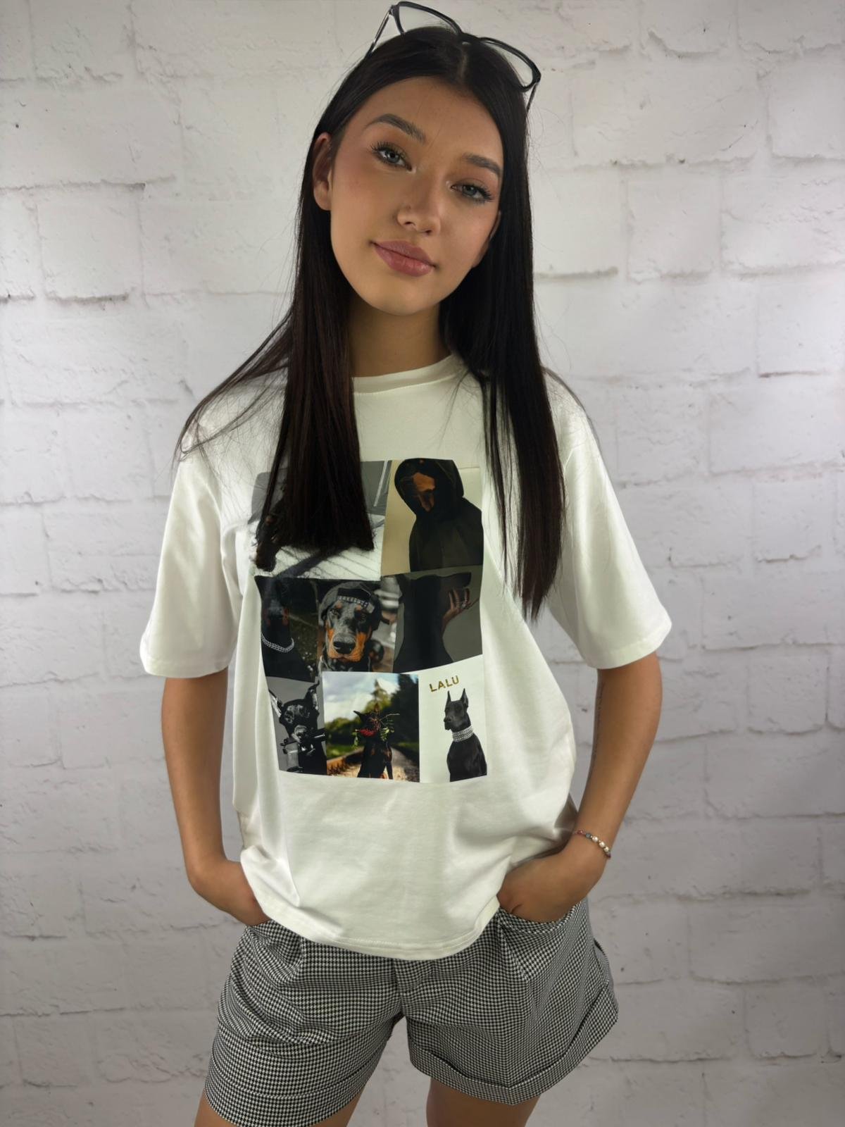 Casualowa koszulka w białym kolorze z nadrukiem w formie kolażu przedstawiającego psy rasy doberman. Modny, nowoczesny design sprawia, że t-shirt pasuje zarówno do miejskich stylizacji, jak i codziennych, luźnych outfitów. Wygodny krój gwarantuje komfort przez cały dzień.