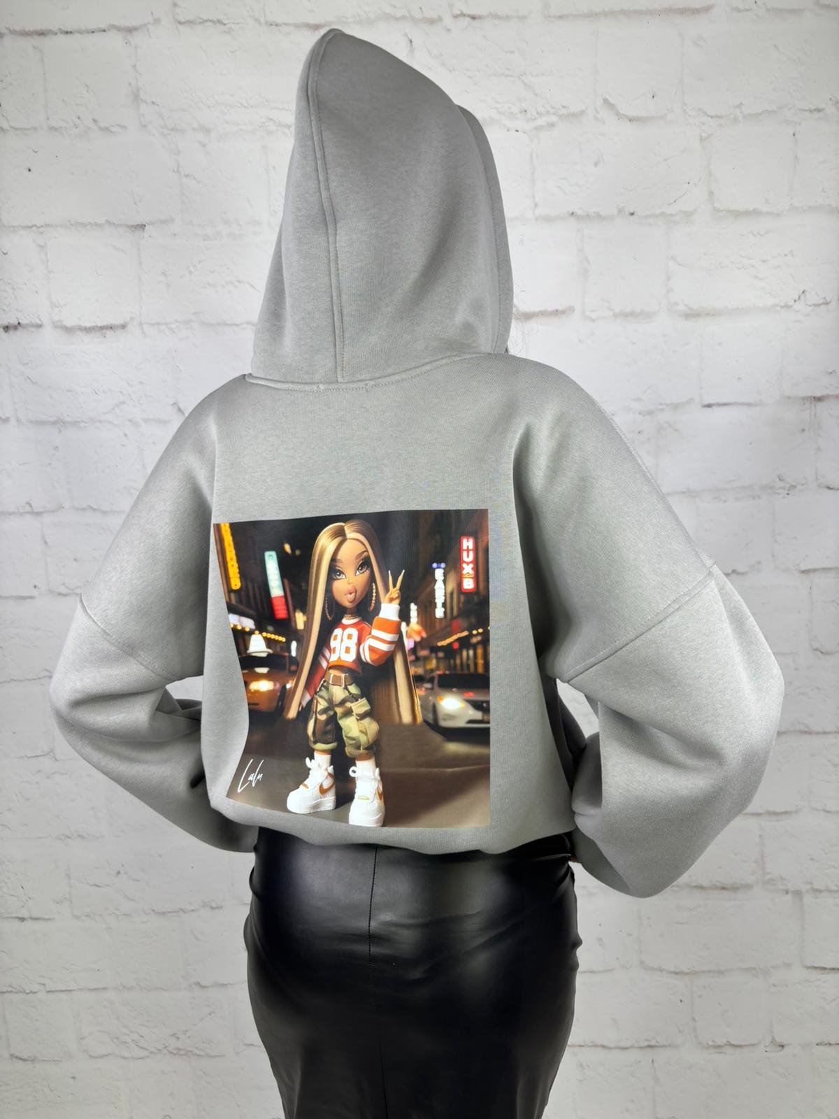 Modna bluza z kapturem w rozmiarze uniwersalnym. Z przodu gładka, klasyczna, a na plecach duży nadruk z postacią w streetwearowym stylu. Luźny krój i miękki materiał zapewniają wygodę oraz swobodę ruchów. Idealna do codziennych stylizacji.