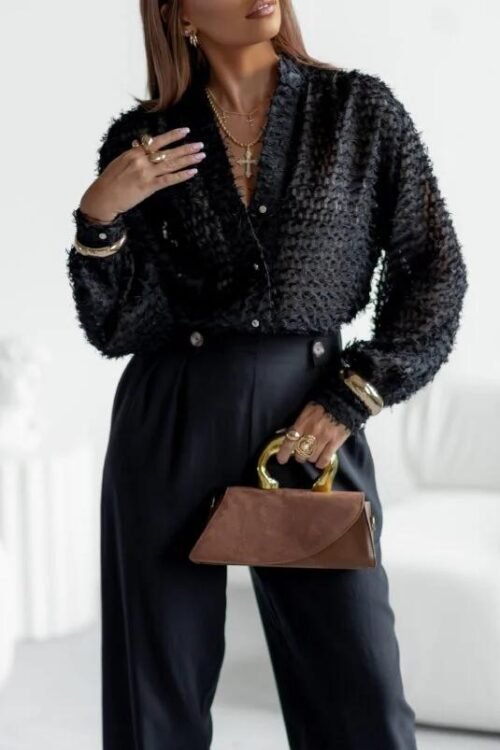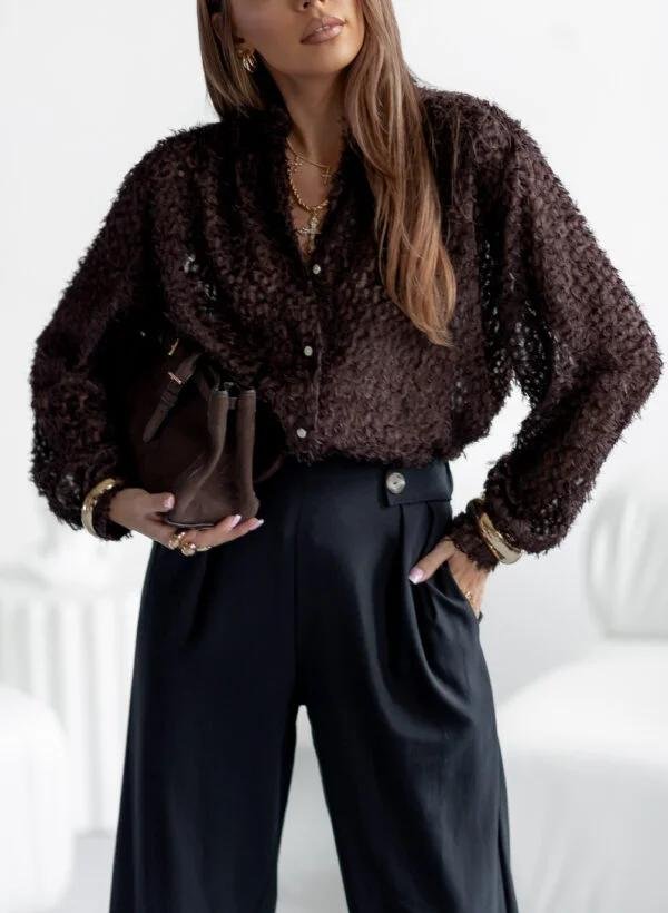 Koszula o klasycznym kroju ze stójką. Zapinana z przodu na drobne, złote guziki. Rękawy zakończone mankietem. Subtelne marszczenia z tyłu oraz na ramionach. Uroku dodaje delikatna transparentność tkaniny.