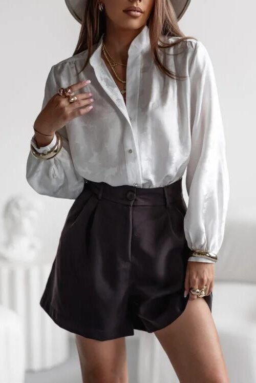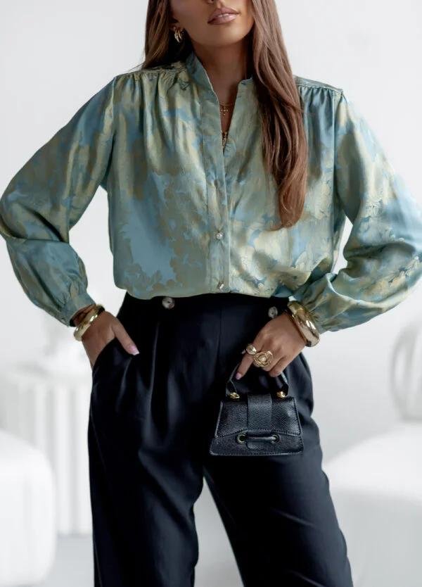 Koszula o klasycznym kroju ze stójką. Zapinana z przodu na drobne, złote guziki. Rękawy zakończone mankietem. Subtelne marszczenia z tyłu oraz na ramionach.